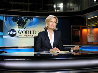 Diane Sawyer was all business on a busy first day as anchor of ABC News' flagship evening newscast on Monday, save for a brief salute