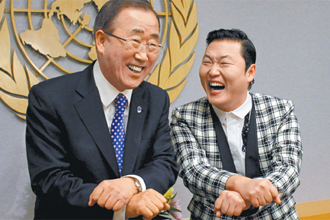 Rapper Psy gives Ban Ki-moon a Gangnam Style dance lessons while delivering a $7-mil. check.