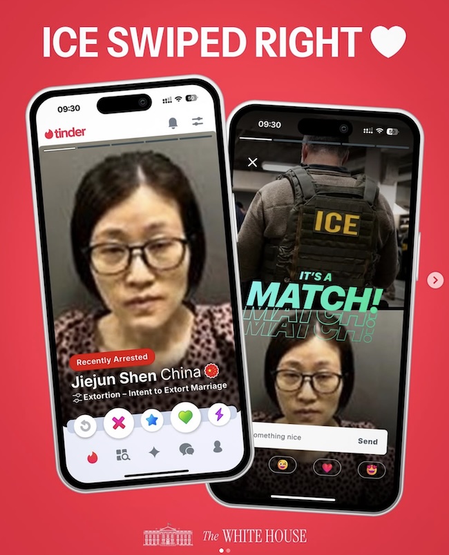 The White House official Instagram account parodied the Tinder app to mock a Chinese woman now in ICE custody.