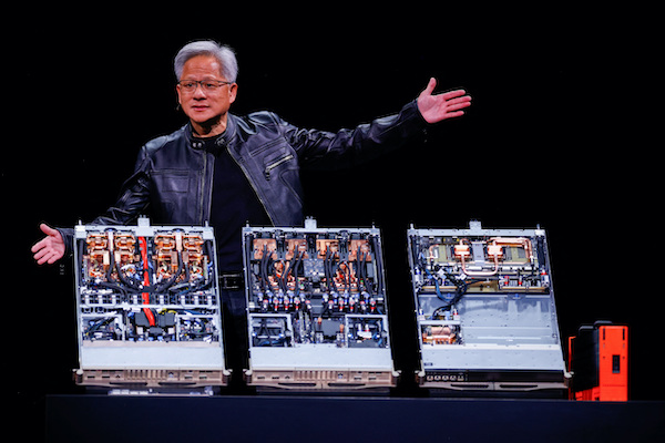 Jensen Huang presents Nvidia's emergence as de facto AI chip industry standard setter.