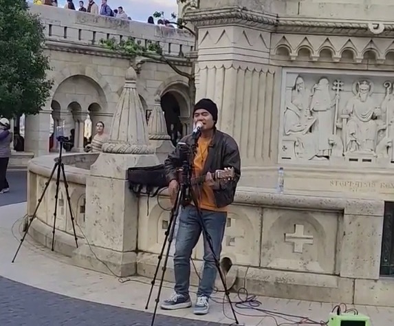 A singer/guitarist from China's Yunnan Province was enchanting an evening crowd at the Fisherman's Bastion in Budapest.