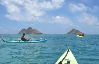 Rather than aiming directly for the Mokes far off toward our right, we paddled straight away from shore. The safety video had warned that the lifeguards could slap a big fine on kayakers dallying near the beach among the swimmers. We were about two hundred yards out from the beach before we cut to the right and headed southward, trying to keep at least a diagonal attitude toward the waves that kept lifting and dropping us. To avoid the chance of being tipped over we paddled diligently after our teen who was about a hundred yards ahead of us.